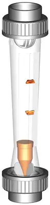 Şamandıra, yukarı doğru uygulanan akış kuvveti ile aşağı doğru uygulanan yerçekimi kuvveti ve sıvının kaldırma kuvveti dengelenene kadar konik boru içinde yükselir.